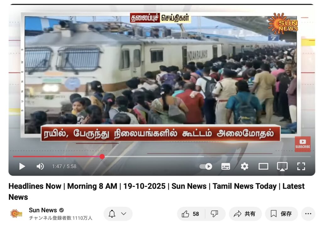 南インドでは家族と祝う大切な祝祭「ディワリ/ディーパーヴァリ(தீபாவளி)」の時期になると、多くの人が都市部から故郷へ帰省します。そのため、鉄道駅(ரயில் நிலையம்)やバスターミナル(பேருந்து நிலையம்)は大混雑!